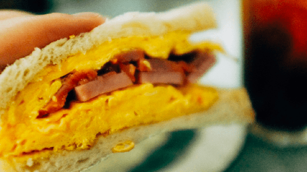 两片软软的面包中间夹着四只鸡蛋做成的炒蛋,鸡蛋和叉烧比面包要厚得多!嫩滑的鸡蛋和香甜的叉烧,再加上未经烤过的去边面包,一口下去让人回味无穷。
