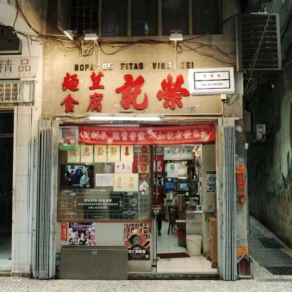「荣记豆腐面食」距离南屏雅叙不远, 就在大三巴背后的街巷之中。店面比较小旧,所以人多的时候要拼桌子坐。