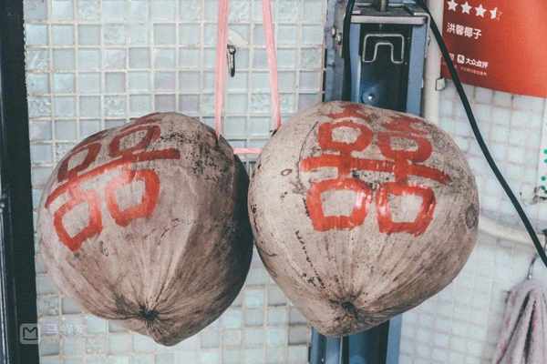 澳门人相信椰子 能给婚嫁带来喜气,正所谓“有爷有子”,所以店门口的椰子上都贴上了喜字。