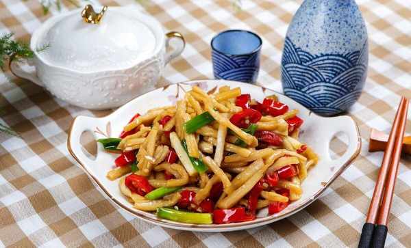 竹笋半斤,切丝,用植物油翻炒,加盐调味,炒熟后开吃,适用于痛风间歇期。