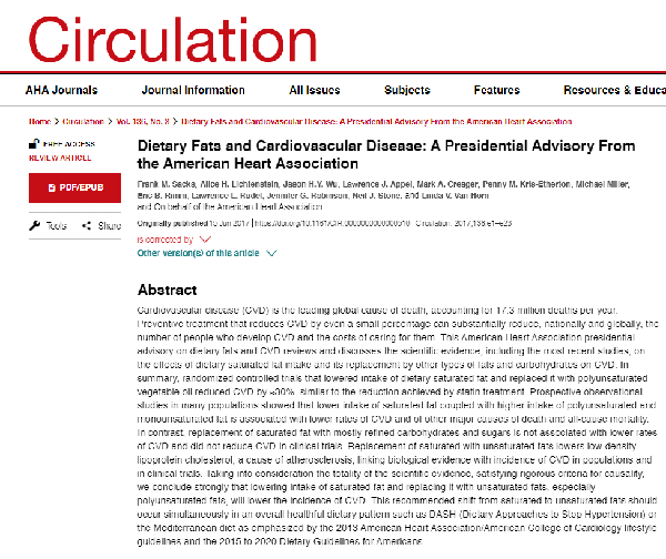 其中比较新的结论来自美国心脏协会,他们在2017年发表了一篇论文专门讨论脂肪对健康的影响, 其中再次强调了应当减少乳制品、脂肪、猪油、牛油、棕榈油这些富含饱和脂肪酸的食物来源,立场已经非常鲜明了。