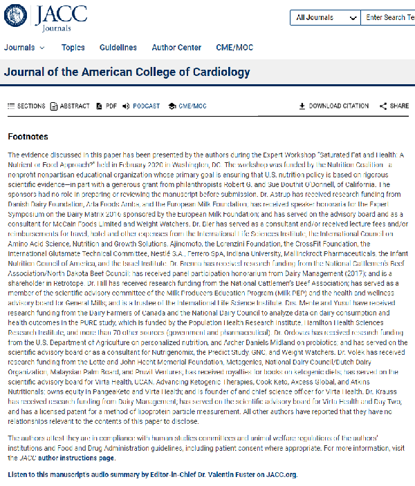 反倒是鼓吹饱和脂肪无害的人经常引用的那篇今年发表于JACC的综述,结论是说全脂牛奶、未加工肉类、黑巧克力等食物对心血管健康没有什么危害, 但你要真看下面的利益相关声明,足足有一页,很多都是乳制品行业的。
