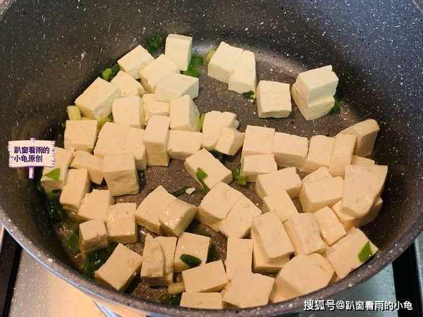 步骤4:火上坐锅,锅热后加入适量食用油,油热后下入葱花,煸出香味后,下入豆腐丁,搅拌均匀。