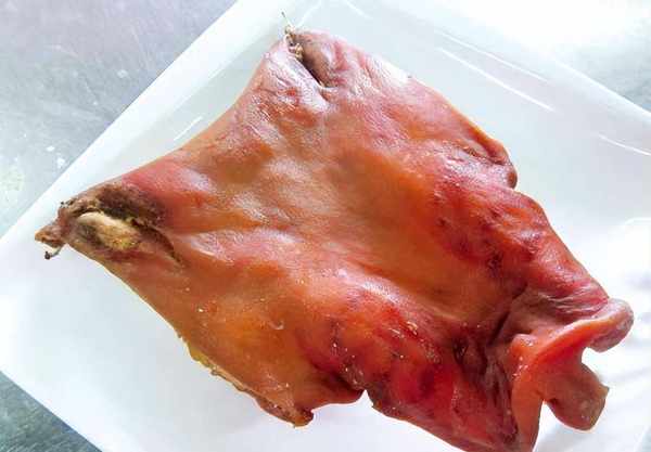 2:净锅炙热,下入大豆油烧至五成热,下拍散的蒜子爆香,下韭苔和红泰椒炒出辣味,下腊猪脸偏香,调入盐、味精、酱油大火爆炒入味,淋芝麻油翻匀出锅即可。
