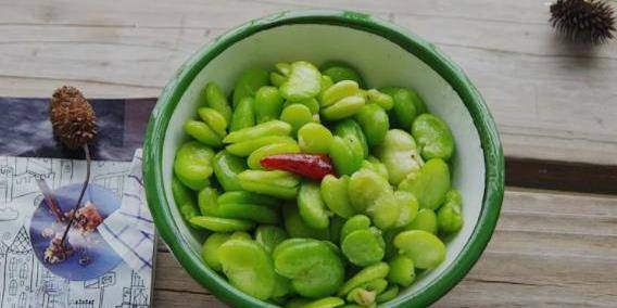 2、放蚕豆翻炒到豆子颜色变绿变深