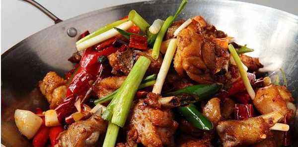 辣子鸡:鸡肉洗净切成小块,干辣椒用水稍微洗一下,锅置火上,加油烧热,下入鸡肉块炸至黄金色时候捞出来,原锅留油,炒香干辣椒姜末蒜末葱花下入鸡块盐料酒花椒油,炒至鸡块入味,加味精炒匀即可。