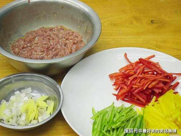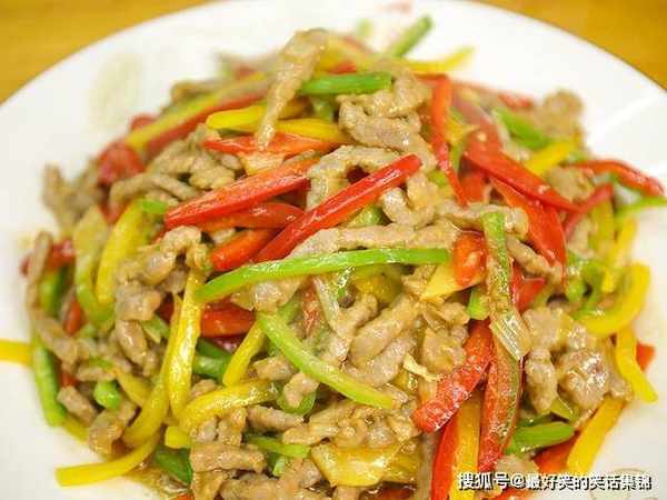 一块牛里脊切成筷子粗细的长条,加盐、鸡粉、胡椒粉、蚝油、生抽,把事先准备好的葱姜料酒水也倒进去,顺着一个方向快速地搅打,磕进去一个鸡蛋清继续搅拌,最后再一小撮淀粉腌制10分钟;黄椒、红椒以及青椒各一个切成细丝搭配颜色。