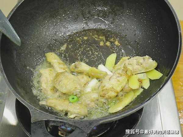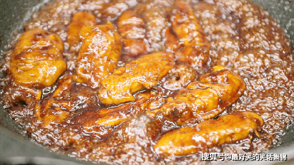 锅内烧油,放入几粒冰糖开小火慢慢炒化,需要不停地搅拌和观察,等到锅内出现气泡、糖汁变成红棕色时倒入鸡翅颠锅翻炒,使鸡翅裹满糖色,倒入准备好的小料炒出香味。