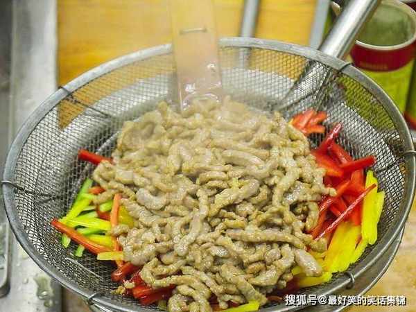 锅里烧宽油,油温升至四成热时把肉丝倒进去快速搅散,20秒的时间肉丝变白捞出控油。