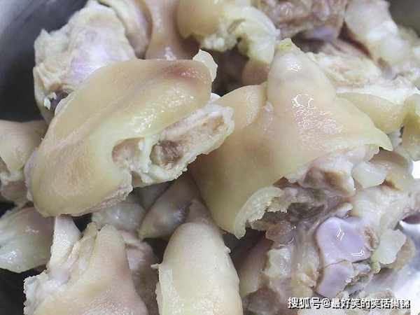 适量的生花生用温水浸泡1个小时后去皮;两个猪蹄用喷枪去除皮腥味和残余猪毛,刮净焦黑的猪皮,再用清水洗净后剁成小块儿。