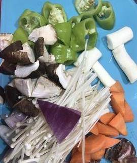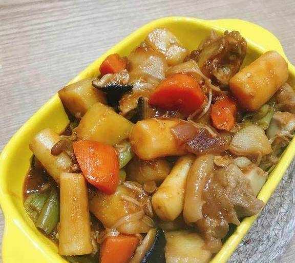 准备用料:胡萝卜1根、红薯、土豆、山药、金针菇、年糕、猪蹄、番茄酱、耗油、豆瓣酱、味达美酱油、尖椒、香菇、洋葱