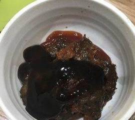 碗中加入两勺番茄酱,两勺豆瓣酱,两勺耗油,一勺味达美酱油,调匀酱汁备用