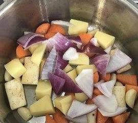 锅底融化黄油,加蒜瓣爆香,先铺入不容易熟的蔬菜翻炒