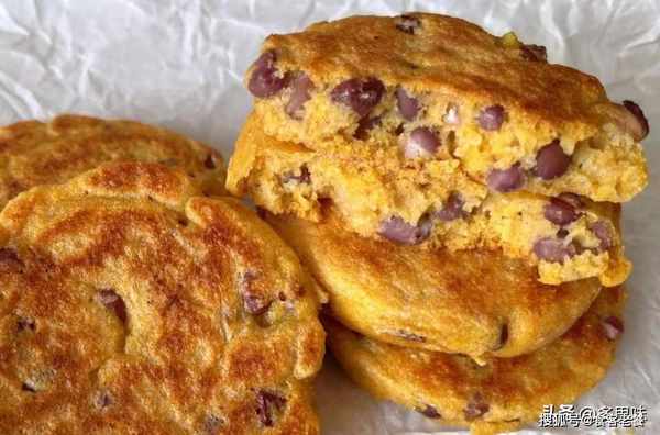 3:发酵好的面团里加入蜜豆拌匀,锅中刷薄薄一层油小火煎至两面金黄即可,少刷一点油能激发玉米面的香味,我借助了家里的圆形煎蛋模具,事实证明不用模具也可以,最开始煎的时候锅体受热不均匀会不好看,越到后面形状越好