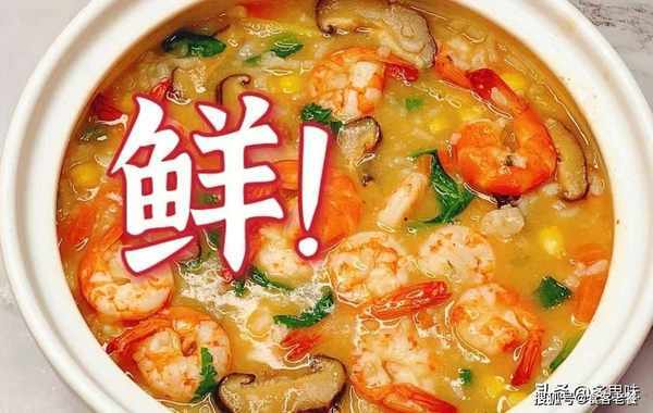 食材:鲜虾、胡萝卜、玉米、香菇、青菜、米、姜、葱、白胡椒粉、盐