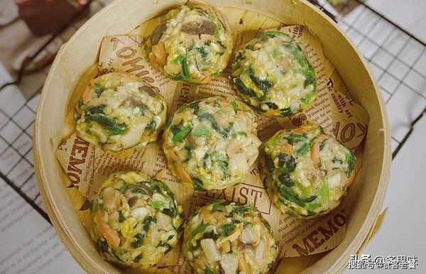 食材:菠菜、胡萝卜、香菇、 蛋、虾米、面粉、蚝油、酱油、盐、 鸡粉、橄榄油