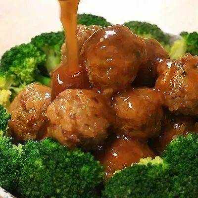 猪前夹肉500克(肥三瘦七)、宴友食用油、糯米100克、姜末20克、生粉适量、鸡蛋2个、盐适量、鸡精适量、胡椒粉半勺、料酒一大勺、老抽适量、西兰花一个(摆盘用)、清水适量、胡椒适量