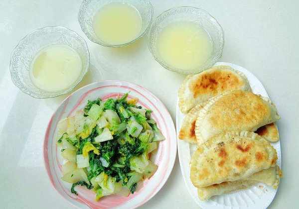 炒韭菜蛋盒,我是提前和好的面团放冰箱里炒的。一边慢慢煎盒子,一边可以把菊花菜洗干净。玉米粥煮熟后,可以炒菊花菜。这样,早餐的主食和流食就都准备好了,美味的早餐就可以端上餐桌了。
