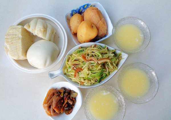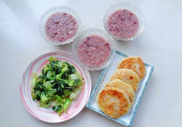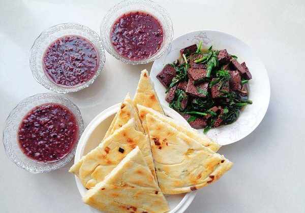 这样的早餐有耐饿的紫米粥和煎饼,也有配粥的炒菜。