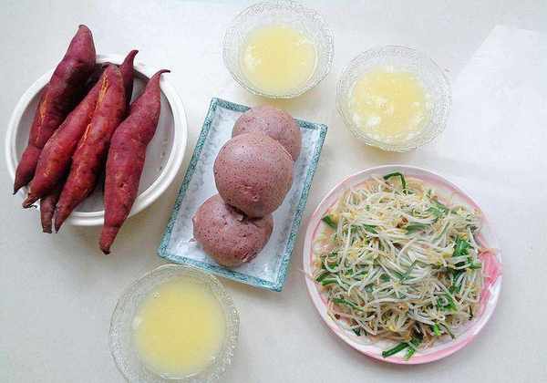 我家早餐喜欢吃五谷杂粮,尤其是冬天吃红薯和南瓜。我边蒸馒头边蒸红薯,煮小米粥。这段时间洗了韭菜和绿豆芽。