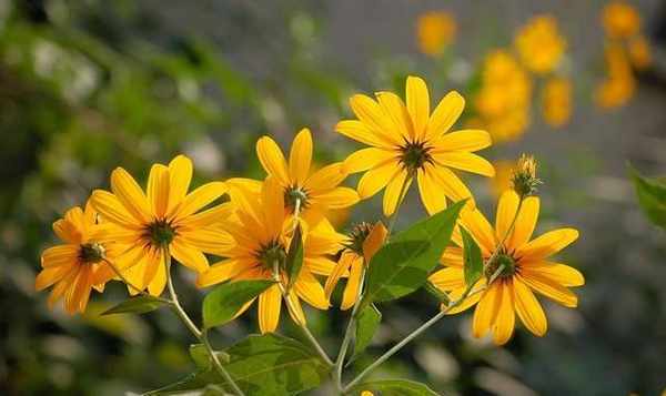 菊芋的叶子与我国种植的向日葵叶子很相似。它的茎也和向日葵很像,上面的花也有点像,只不过这个菊芋的花要比向日葵的花盘小很多。是的,秋天开着黄色的花还是很美的。