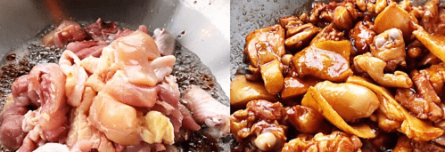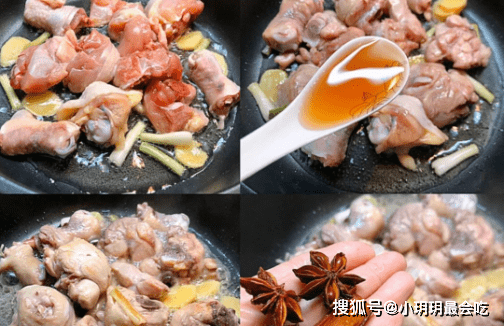 第二,炒糖色,油少许,是黄焖鸡的正确做法,热油后,放入冰糖,搅拌冰糖,糖化变色,起大泡入锅,鸡肉入锅立马变得金黄,加老抽,永远达不到这个效果;