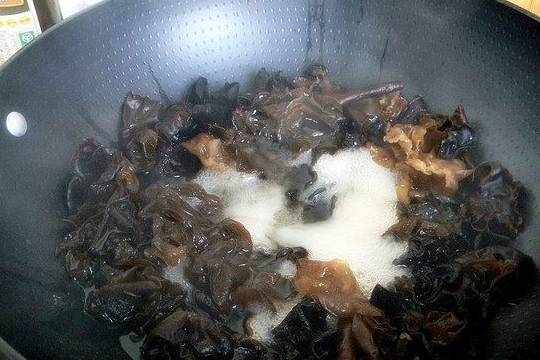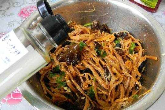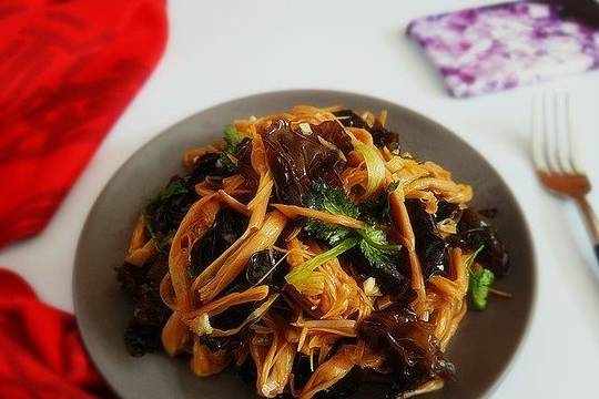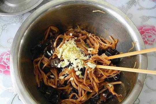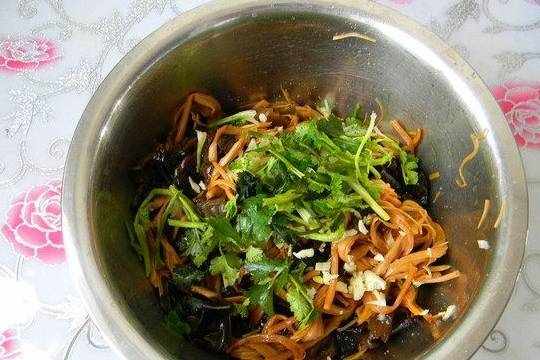 干木耳30克、干黄花菜30克、盐3克、醋20克、糖10克、红油适量、香油适量、大蒜半头、香菜2棵