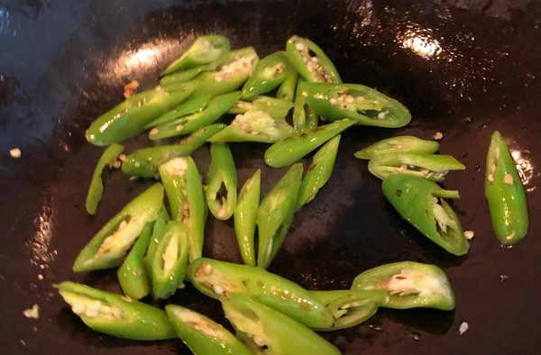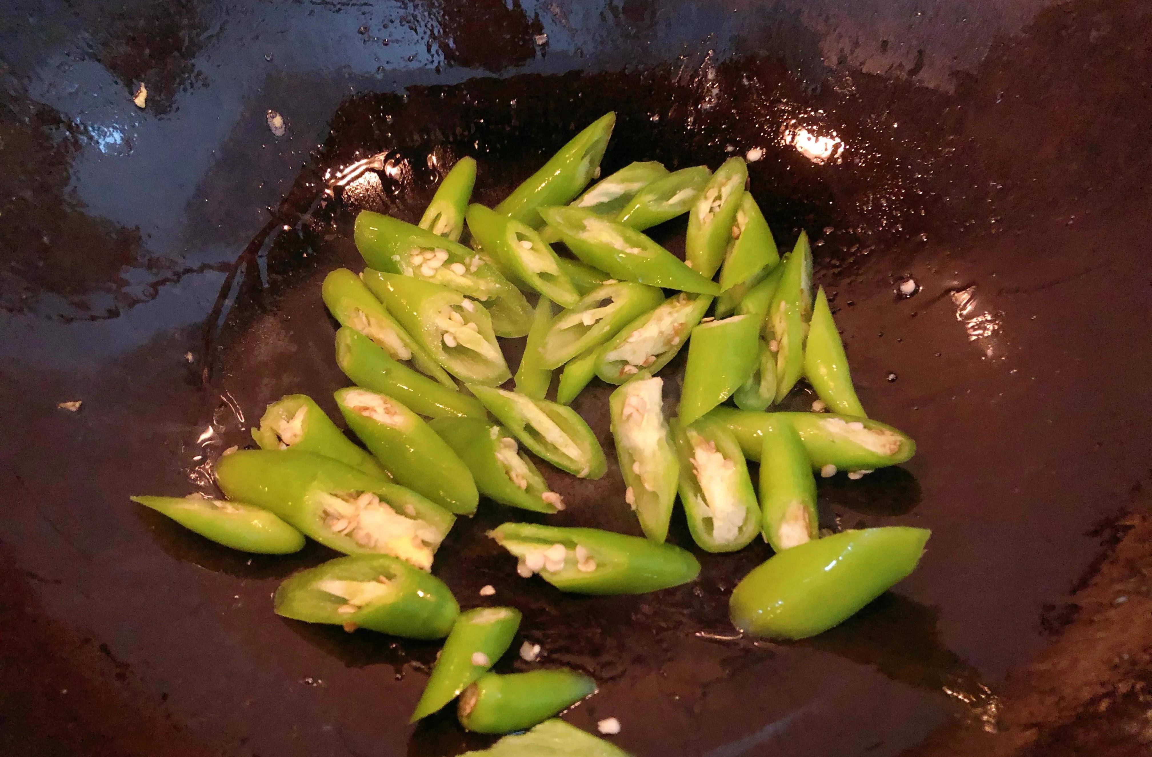 小火干煸螺丝椒,螺丝椒煸的干巴巴的有些许褶皱,倒入一勺生抽,爆香,瞬间香辣味儿十足。