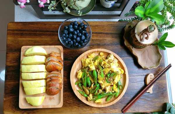 今日美食制作分享:辣椒炒鸡蛋、鸡腿肉香肠、玉米面馒头、蓝莓。