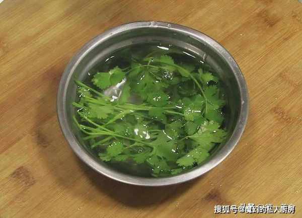 现在准备一下小料,大葱白一根,切成3厘米的段,生姜一小块,切成姜片,香菜几根,去根后,泡在清水中。