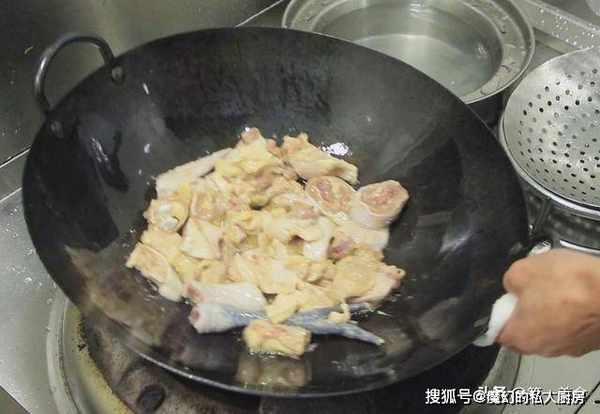 10分钟以后,我们开始烹饪,锅内烧少许油,把鸡块放入锅内煎一下,鸡块煎一下,煮出来的汤汁会更白,吃起来还紧实。