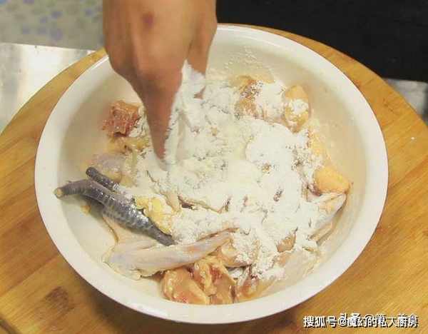 然后撒上一点干淀粉,继续搅拌,淀粉能使鸡肉紧实,吃起来口感嫩滑,拌匀以后,静止腌制10分钟,给鸡肉入味。
