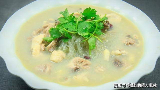 中间要掀开锅盖看一看,免得把汤汁熬干,鸡肉炖烂的同时,粉条也软烂了。
