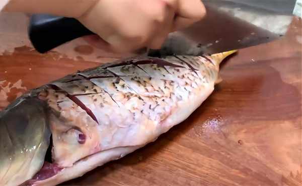 1.首先准备新鲜的鲤鱼一条去掉鱼鳞和内脏,然后在表面改上一字花刀。在里面加入葱姜、料酒用手抓拌均匀腌制五分钟。