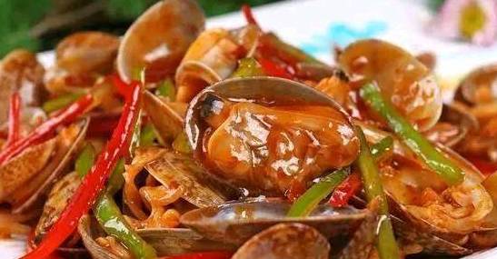 2.将锅烧热,放油煸香干辣椒,将滤净水的蛤蜊倒入锅中