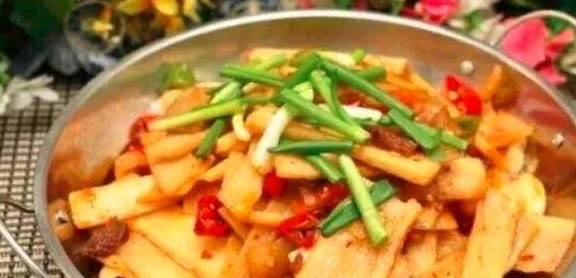 5.之后加入五花肉片和豆瓣酱一起炒匀,再加入沥干的山药条和其它调味料干炒五分钟左右,让调料充分入味;