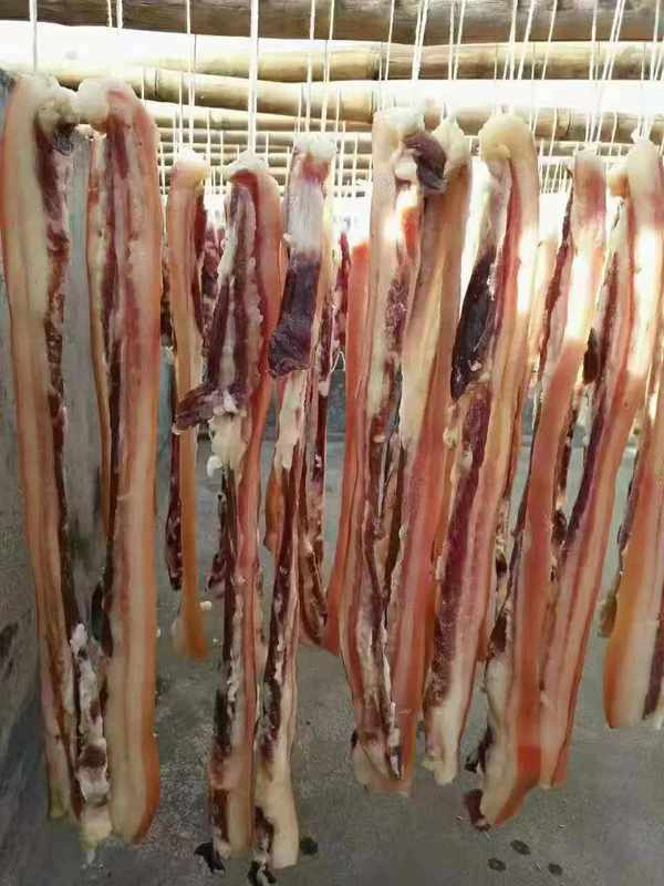 腊肉也是像腊鸭一样,买上好五花肉,买回来先不洗,先用盐、酱油腌制,腌制一两天之后,拿温水洗净,然后切个扣穿绳挂去竹竿晾晒。