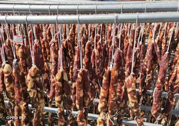 还有出名的腊肠,市场上买点羊肠,买几十斤五花肉,切片,加上盐、白糖、酱油、高度白酒腌制一晚,然后买个灌肠机,灌入羊肠,一节节绑好,放到太阳底下去晒干。