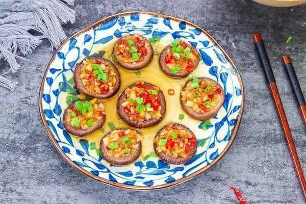 2、香菇洗净,用上汤煮滚调味后捞出摊平,菇面向下,用砧板压平(泡香菇水去沉渣留用)。取其中18个,菇面向下摆在案板上,洒上适量生粉,每个菇上放一份馅心,用余下18个香菇一一盖起来,即成香菇盒生坯,整齐地摆在碟内,放锅中蒸10分钟左右;