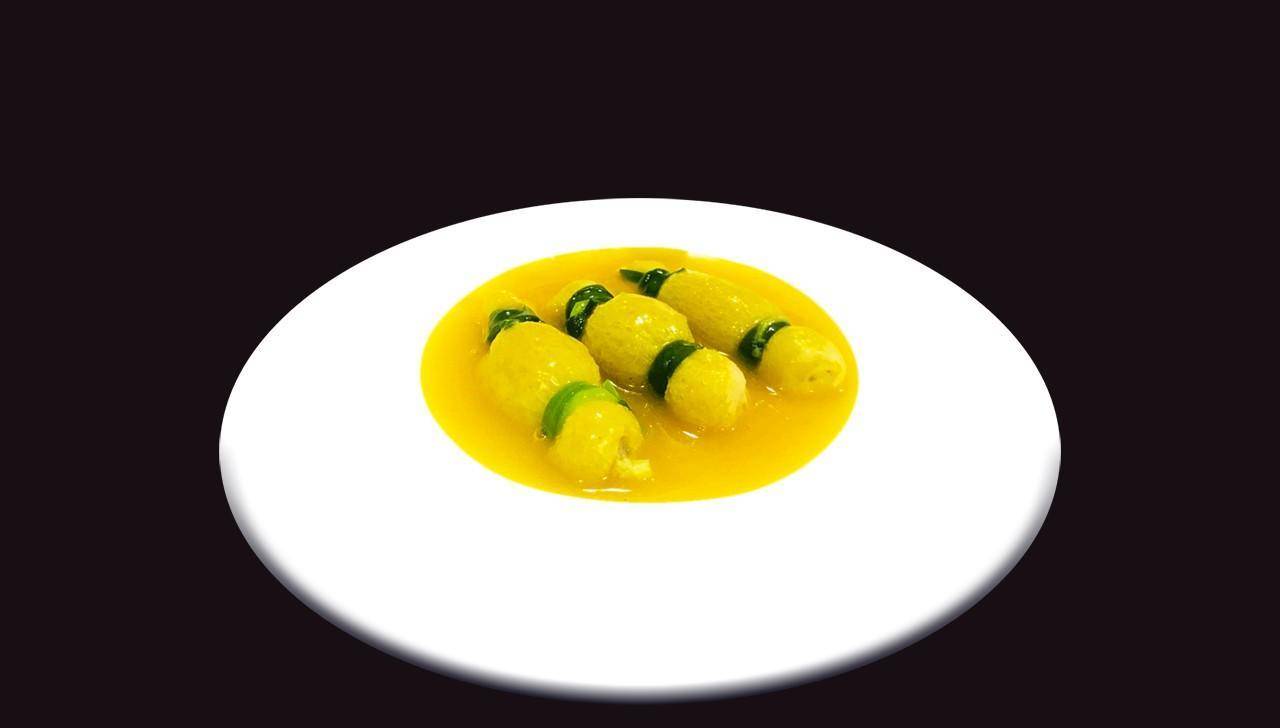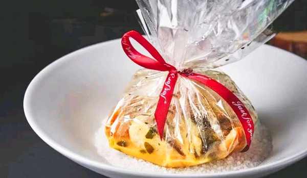 将高汤烧开,加入做好的山药、竹笋,文火煮熟,捞出装盘,在原汤中加入南瓜泥,勾芡后浇在幸福袋上。