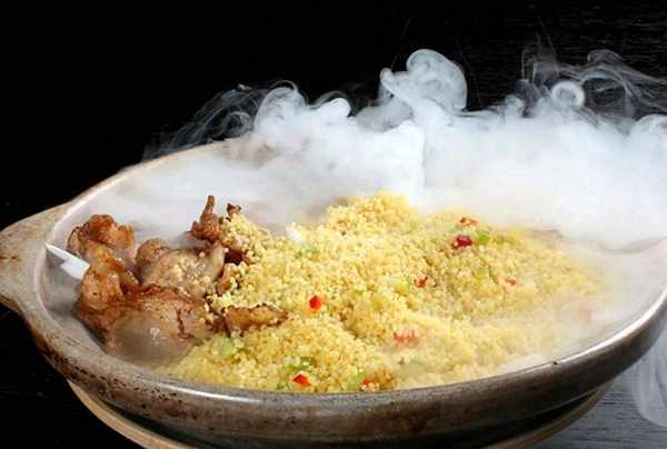锅烧热,加入备好的小米、盐、米饭和红、青椒炒香,放上炸好的肉片。