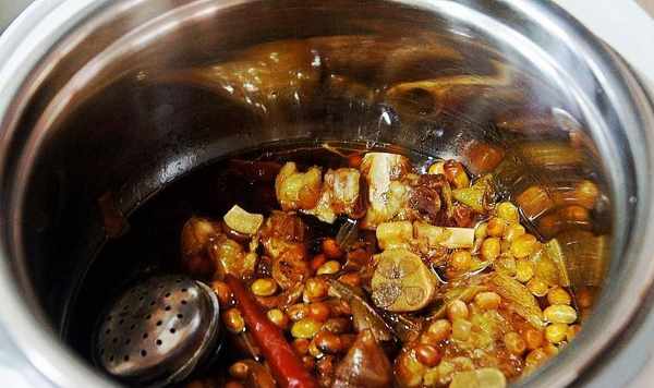 取出猪腿,沥干水分,再沥干猪毛和内脏。将葱、姜、蒜去皮,切齐胸高的块,拌入调味汁,将花椒、八角等香料洗净,放入调味盒中。