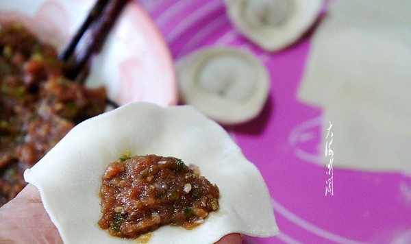 取出做好的面团,擀成饼底,将面团切成宽条。对折切成大小相等的馄饨皮,取一张馄饨皮,放上馅料,对折捏紧,然后将两端连接捏紧。