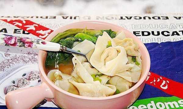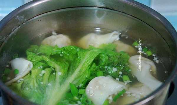 煮馄饨:锅里的水烧开后,放入馄饨。一旦打开,馄饨就会浮起来,然后倒入冷水中。第二次翻转,然后倒入冷水。第三次转火,放入洗净的生菜叶,加入葱花、胡椒粉、生抽、香油调味即可。
