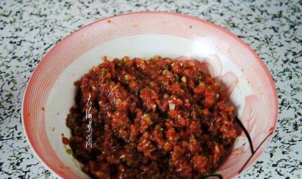 将里脊肉磨成肉馅,加入料酒拌匀去鱼腥味,再加入五香粉、香菇粉生抽、蚝油、葱花、姜丝,顺着一个方向充分拌匀,最后加入橄榄油并充分混合以锁住水分。青椒洗净切碎,加入肉末拌匀。