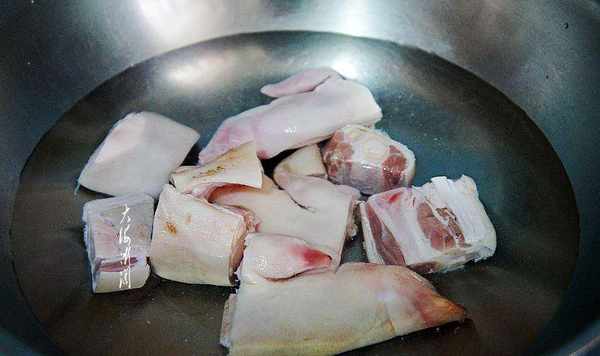 做法:猪蹄切块,然后清洗干净,猪蹄放入冷水锅中焯一下,大火烧开。