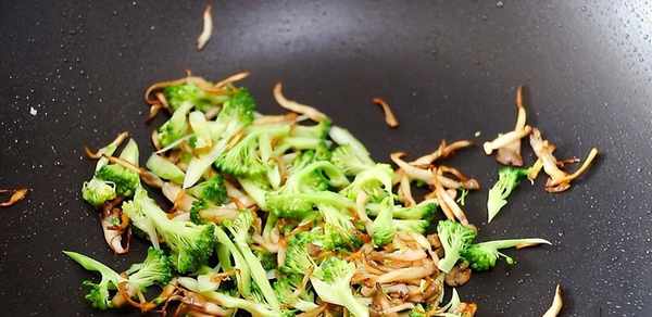4。锅中倒入适量的油。油热后放入牛肝菌,炒至变黄后倒入西兰花炒匀;