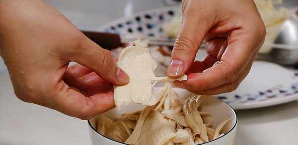 2。修珍菇洗净,沥干水分,用手撕成细丝;