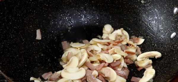 3。然后将准备好的腊肉一起炒熟,然后倒入切好的香菇,炒匀,炒至腥味消失,盛出待用;
