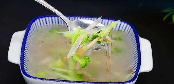 准备材料:香菇,西兰花,猪肉,盐,鸡高汤,白胡椒粉,香油